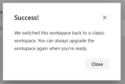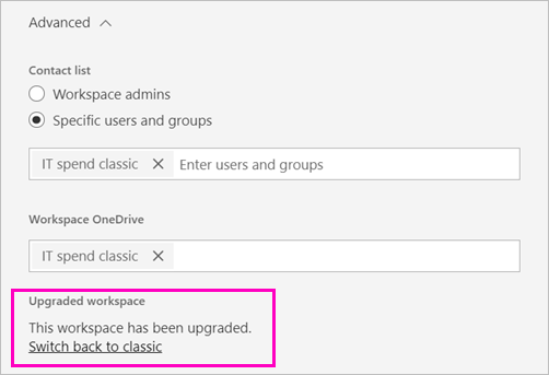 作為工作區升級體驗的一部分,你可以選擇在升級后的30天內退回到經典工作區。此功能會還原工作區內容與原始Office 365 Group的關聯。如果組織在使用新工作區方面遇到了重大問題,可以使用此功能,但存在一些限制。