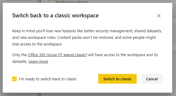 概述:在Power BI中將經典工作區升級到新工作區后30天內可選擇退回到經典工作區,建議在退回之前先閱讀本文中有關切換回經典工作區的注意事項。