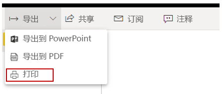 也可以在Power BI服務中查看報表時選擇“導出”>“打印”,打開打印對話框,直接從報表打印或導出 。