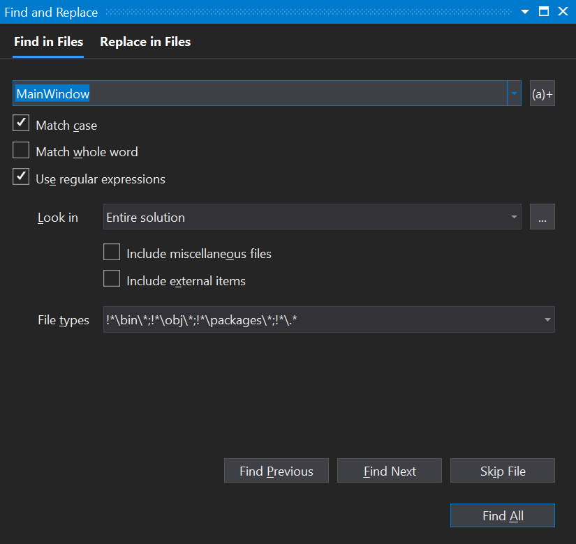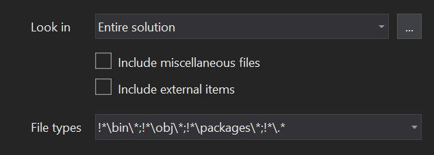 “Look in”框有一個新選項“Current Directory”,它將搜索包含當前打開的文檔的文件夾。搜索解決方案時,有復選框包含雜項文件(已打開但不屬于解決方案的文件)以及外部項(如“windows”文件,你可以參考但不是解決方案的一部分)。