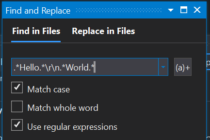 借助Visual Studio 2019版本16.5預覽版2,Regular Expression builder將可用。“Use regular expressions”復選框?qū)⑹鼓梢詫egular expression指定為匹配的模式。使用Visual Studio 2019v16.5預覽版2(或更高版本)選中此框還將顯示“Regular Expression”構(gòu)建器,這對于創(chuàng)建Regular Expression很有用。Regular Expression可以允許搜索跨越多行的字符串,例如表達式“.* Hello.*\r\n.*World.*”將匹配任何出現(xiàn)的字符串“Hello”,而在下一行的任何位置都出現(xiàn)了字符串“World”。