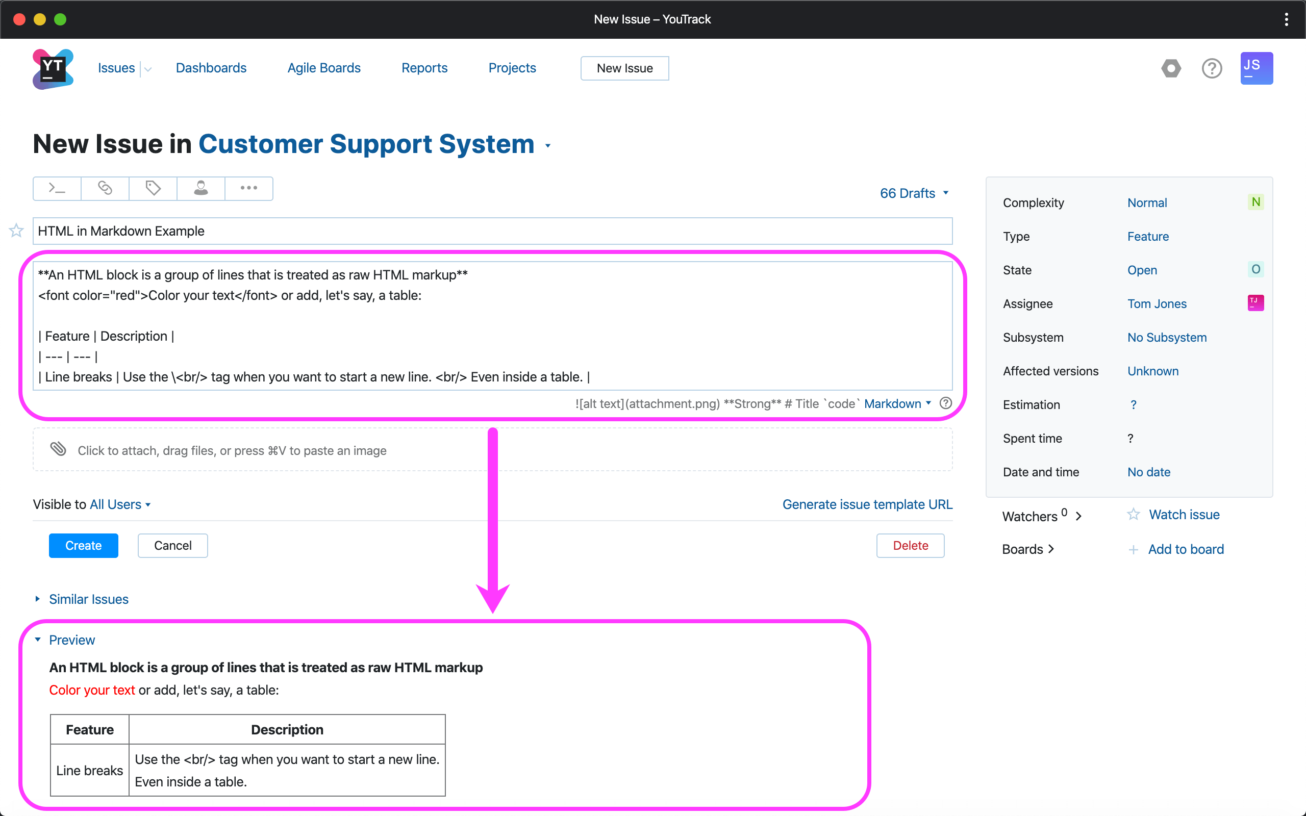 我們擴展了Markdown實現以支持HTML標記。使用可折疊的塊,自定義文本顏色,表格單元格中的換行符等來增強問題的描述,注釋和文本字段。