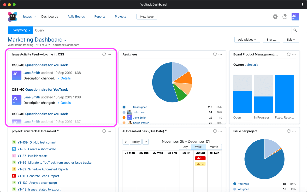 現在,您可以顯示各種預定義事件類別的與問題相關的活動流。為儀表板配置小部件以跟蹤不同項目中的更新或監視特定用戶應用的更改。