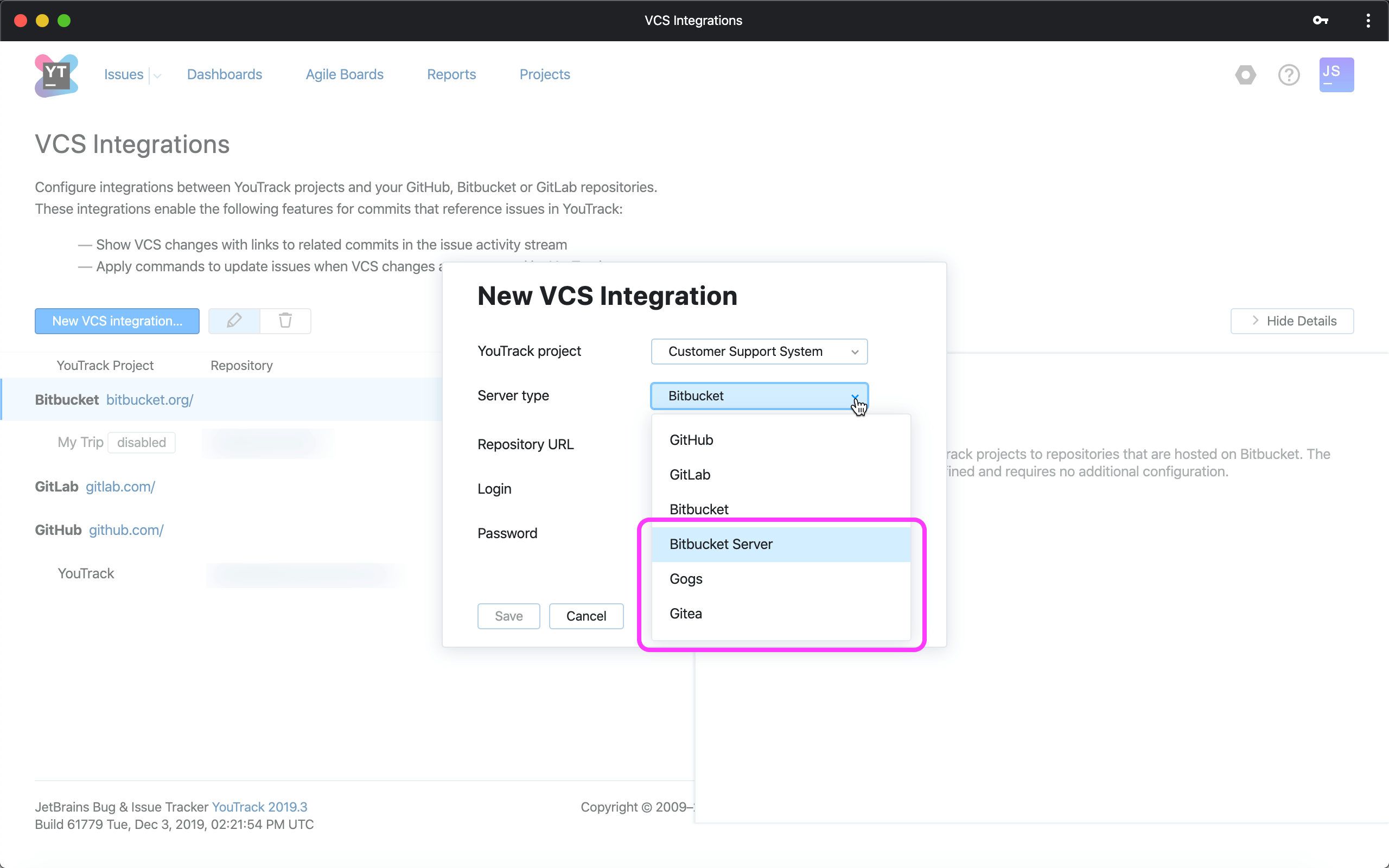 現在,您可以將YouTrack項目鏈接到Bitbucket Server,Gogs或Gitea安裝中托管的存儲庫。