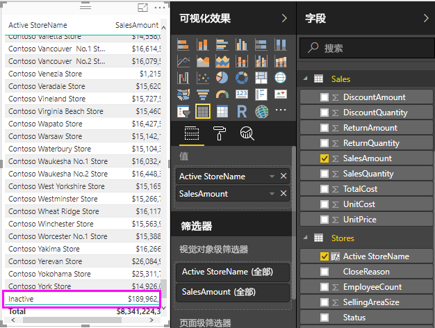 7、和其他任何字段一樣,可以在可視化效果中使用新的Active StoreName列。若要顯示按Active StoreName排列的SalesAmounts,選擇“Active StoreName”字段或將其拖至畫布,然后選擇“SalesAmount”字段或將其拖至表中。在此表中,活躍商店單獨按名稱顯示,而非活躍商店以“非活躍”組合到末尾。