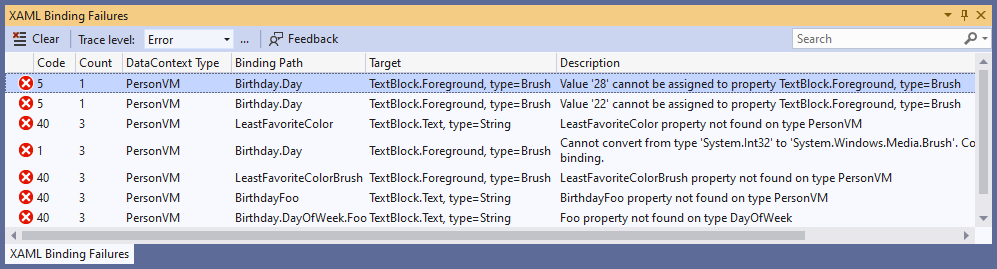此功能意味著開發(fā)人員將不再需要使用輸出窗口來檢測綁定失敗,并且可以更輕易地發(fā)現(xiàn)它們。