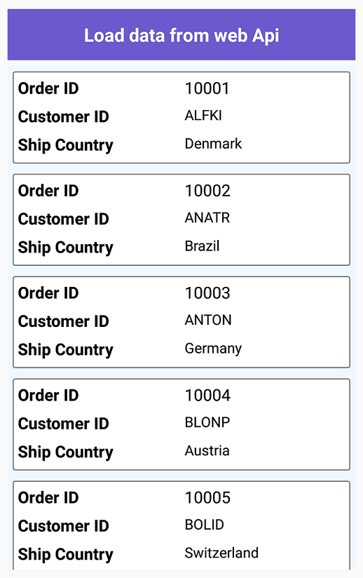 public async System.Threading.Tasks.Task RefreshDataAsync(){ WebAPIUrl =“//ej2services.syncfusion.com/production/web-services/api/Orders”; //在此處設置REST API URL。 var uri = new Uri(WebAPIUrl); 嘗試 { var response = await client.GetAsync(uri); if(response.IsSuccessStatusCode) { var content = await response.Content.ReadAsStringAsync(); Items = JsonConvert.DeserializeObject (content); 退換貨品; } } catch(Exception ex) { } return null;}