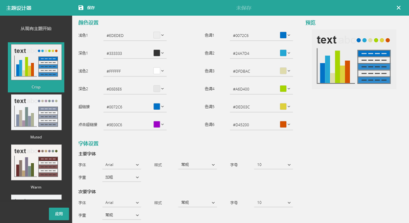 通過主題設計器,可以創建自定義的主題樣式,并應用到您的儀表板和報表中,以此滿足您企業獨有的樣式需要。同時,主題文件也能共享給其他用戶使用。
