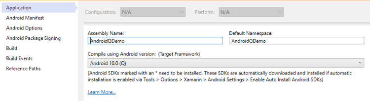 通過(guò)在Visual Studio項(xiàng)目屬性頁(yè)的“ 應(yīng)用程序”選項(xiàng)卡下將Android版本編譯為(目標(biāo)框架)到Android 10.0(Q),開(kāi)始使用Android Q Preview 。