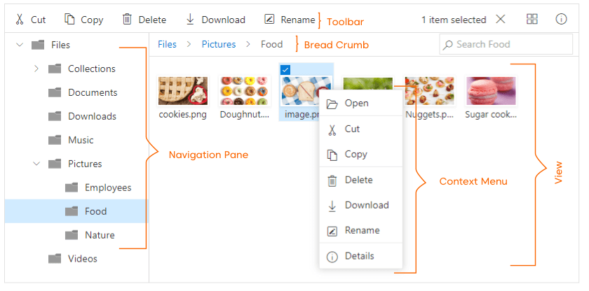文件管理器控件的功能使用80/20規則實現。這將涵蓋有效管理Web瀏覽器中的文件系統的主要業務需求。以下是文件管理器中可用的功能: