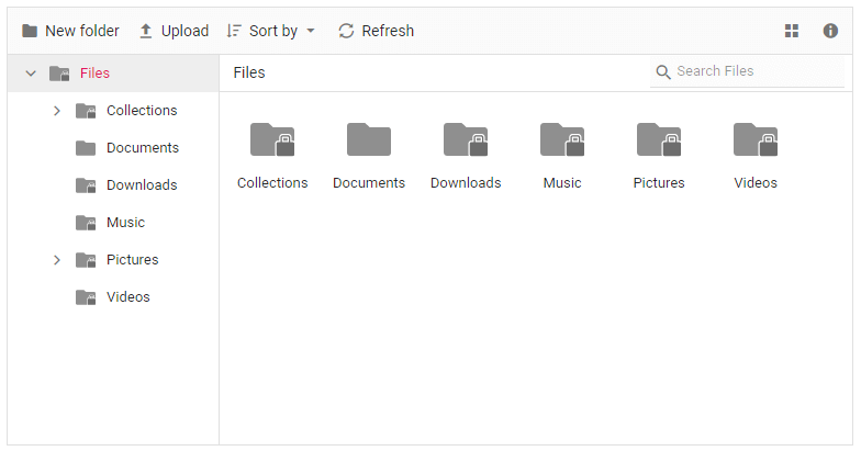 頂部的工具欄擁有執行文件管理操作的所有操作按鈕:創建、剪切、復制、粘貼、上載、下載、重命名和刪除文件夾和文件。
