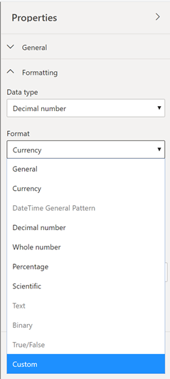 為此,首先在字段列表中選擇字段,然后在屬性窗格的格式化卡中選擇自定義格式選項。