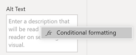 Alt文本是現在具有條件格式的第一個功能。這在可訪問性方面確實是一個巨大的進步。現在可以根據視覺的當前過濾器狀態動態地更改當視覺對象處于焦點時由屏幕閱讀器讀取的Alt文本。例如,您可以在alt文本中調出最高和最低類別,并確信它將始終反映視覺中的當前數據。