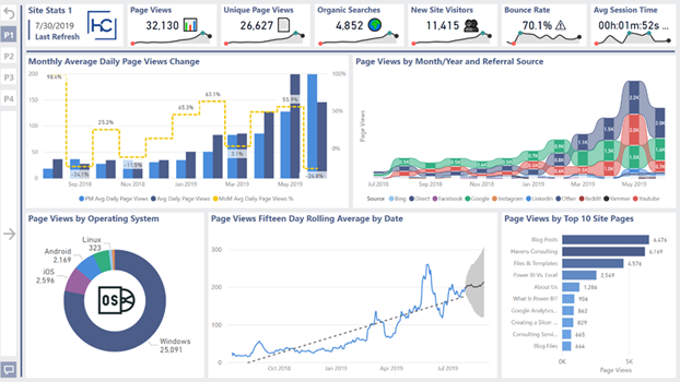該報告本身使用戶能夠對每日頁面瀏覽量進行深入分析,包括預測和可調滾動平均值、月環比流量增益或損失、訪問的半島外圍網上直營、流量來源隨時間變化的趨勢等。此外,該報告還包含許多Power BI特性和功能的優秀示例,包括書簽、假設參數、高級條件格式和自定義視覺效果。總體而言,此報告提供了一種出色的開箱即用的Power BI體驗,是一種增強Google Analytics數據的好方法。