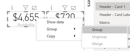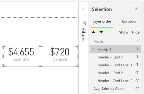 通過分組,您可以在報表頁面上將視覺效果、形狀、文本框、圖像和按鈕組合在一起,就像在PowerPoint中一樣。將對象組合在一起后,您還可以將它們一起移動并調整大小,這樣可以更輕松地處理每頁上分層有大量對象的報表。