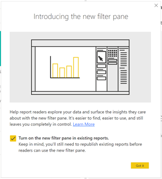 在7月版中,宣布了新過濾器窗格的一般可用性,現在可以將當前報告轉換到新窗格的過程。顯然,微軟希望以對您當前報告影響最小的方式執行此操作。考慮到這一點,8月,當您第一次打開Power BI Desktop時,將顯示一個過濾器窗格自動更新對話框。您一定要利用這次機會,因為微軟最終將自動更新所有現有的報告到新的過濾器窗格。