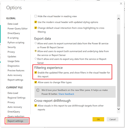 通過此對話框,您可以選擇使用新的過濾器窗格體驗。完成此操作后,只要您打開舊報告,它就會自動顯示新的過濾器窗格。現在,如果在打開報告后保存報告,新窗格將保持不變,再次發布報告后,它將向最終用戶顯示。如果您尚未準備好升級特定報告,則可以通過options對話框中的報告級別設置關閉新窗格。