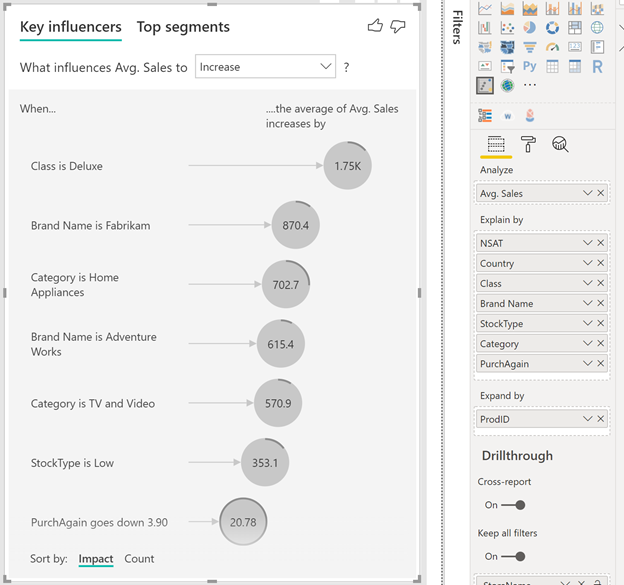 現在,您可以在關鍵影響因素視覺的分析桶中使用度量。默認情況下,我們將根據您在Explain by bucket中包含的字段來評估度量。現場井中還有一個新的擴展桶,可用于優化分析桶中的度量評估的級別。例如,如果您希望對所有數據進行評估,則可以向Expand by bucket添加ID字段。