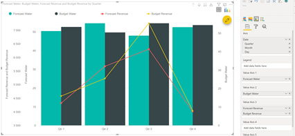 要構建這種可視化效果,首先要將分類軸字段放在Axis存儲桶中。從那里,您將放置要在值軸桶中顯示的每個度量。當您在同一個值軸桶中放置多個度量時,它們將共享該軸,如果您將它們放置在不同的桶中,它們將各自具有唯一的軸。