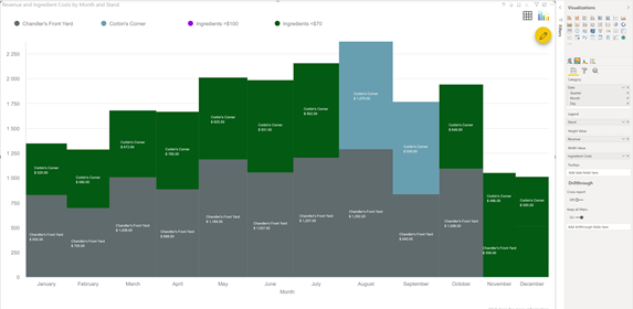 Marimekko圖表是第二個xViz visual,它允許您在兩個尺度上可視化分類數據,使用寬度和高度來顯示它們之間的關系。您可以使用要在值軸上顯示的分類值來達到此視覺效果,如添加度量來定義每個類別的高度,以及設置寬度的不同度量。您還可以向圖例添加類別以進一步分割數據。