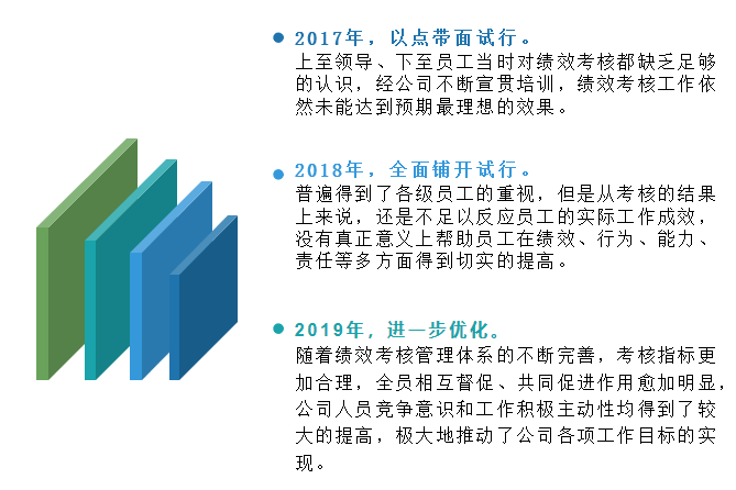 通過2017年-2019年績效考核的實施,評選出了一部分優秀員工,他們獲得了績效工資,年度調薪嘉獎,乃至職位的提升,而個別績效考核不合格的員工,云開平臺登錄頁面·(中國)官方網站本著給予員工改善和提升的機會,并未進行績效工資扣減。