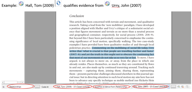 您可以使用關(guān)系節(jié)點(diǎn)來編碼您的文章之間的關(guān)系。當(dāng)你打開一篇文章后,您可以用快速編碼工具欄編寫左端文章關(guān)系情況、中間的關(guān)系類型以及特指的文章及案例。如果尚未創(chuàng)建案例或關(guān)系,只需在指定框中鍵入新項(xiàng)目的名稱即可,如下圖所示: