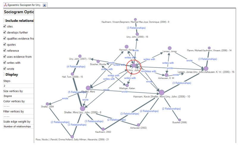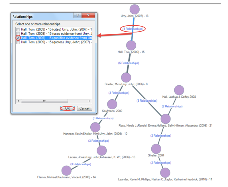 從下面的Network Sociogram中可以看出,Hall(2009)和Urry(2007)之間有四種關(guān)系,當(dāng)我雙擊該線時(shí),彈框會(huì)打開,向我展示這四種關(guān)系是什么。如果我選擇任意一個(gè)并點(diǎn)擊確定,帶有詳細(xì)信息的參考文章將在視圖中打開,如下圖所示: