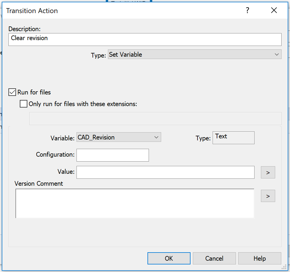 當(dāng)文件從“初始WIP”轉(zhuǎn)換為“初始WIP”時,“至初始WIP”轉(zhuǎn)換中的轉(zhuǎn)換動作可用于清除或?qū)⑿抻喿兞吭O(shè)置為null: