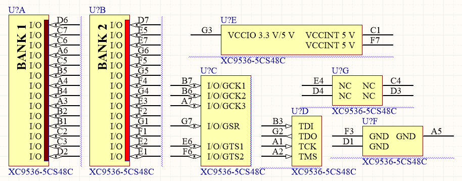 以Xilinx庫(kù)中的XC9536-5CS48C為例,該設(shè)備有七個(gè)單獨(dú)的符號(hào)(從A到G)表示其示意圖: