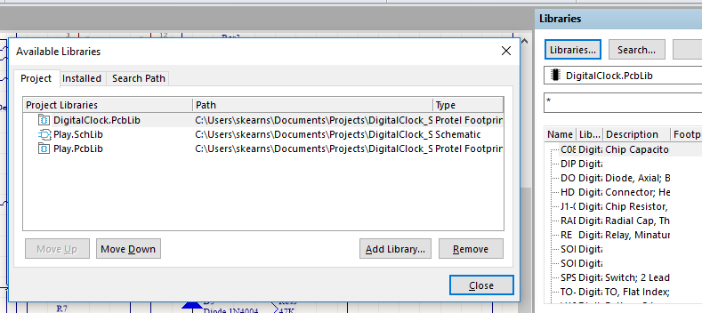 在設(shè)計(jì)項(xiàng)目中,將引用庫(kù),以便可以添加組件??梢酝ㄟ^(guò)“庫(kù)面板”,“庫(kù)...”按鈕添加新的符號(hào)庫(kù):