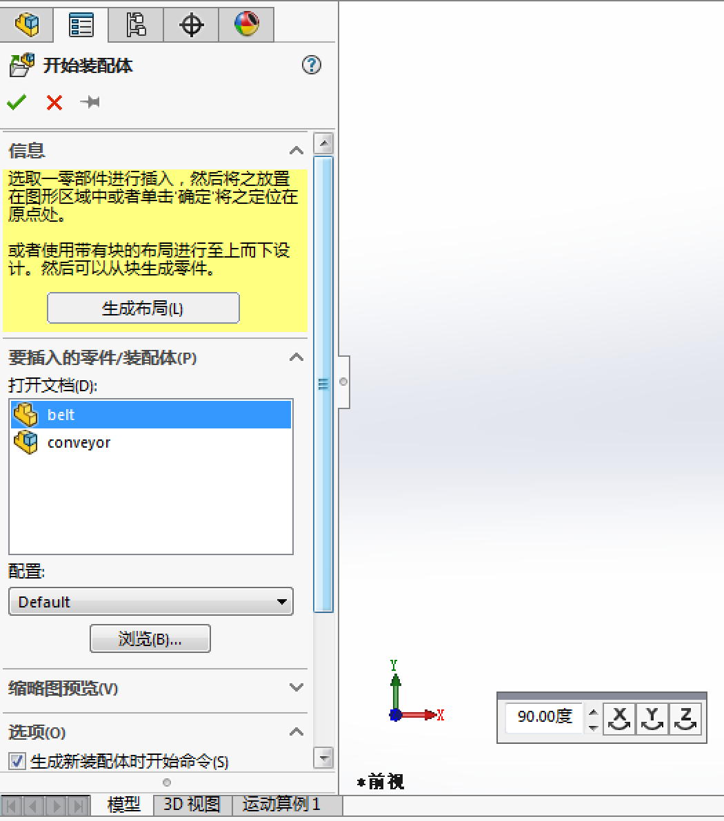 如果打開文檔下沒有可用的部件,則打開打開對話框,以便您可以瀏覽要插入的零部件。要禁用開始裝配體 PropertyManager 的行為,請清除此選項。