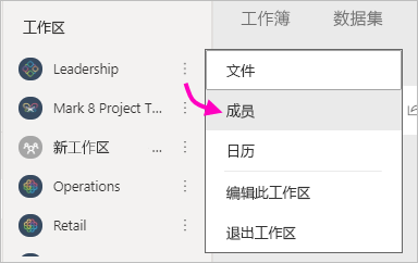 1、選擇“工作區”,選擇工作區名稱旁邊的“更多選項”(…),然后選擇“成員” 。