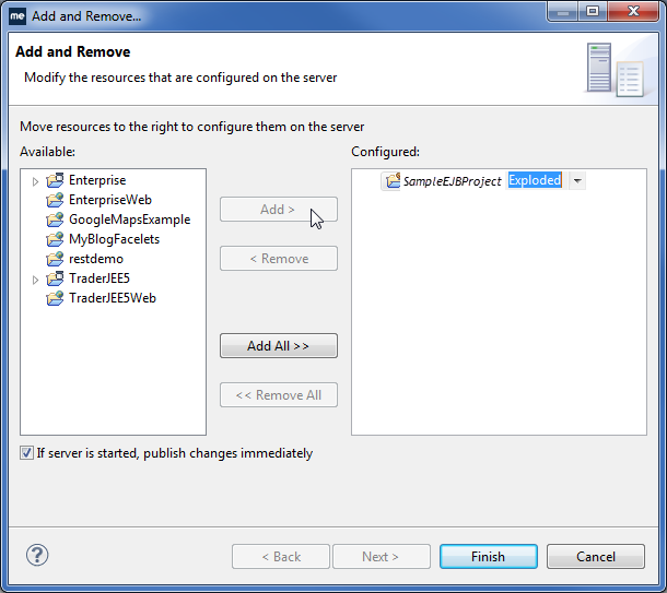 在可用列中選擇SampleEJBProject,單擊“Add”,然后單擊“Finish”。