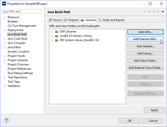 單擊“Libraries”選項卡,然后單擊“Add External JARs”。