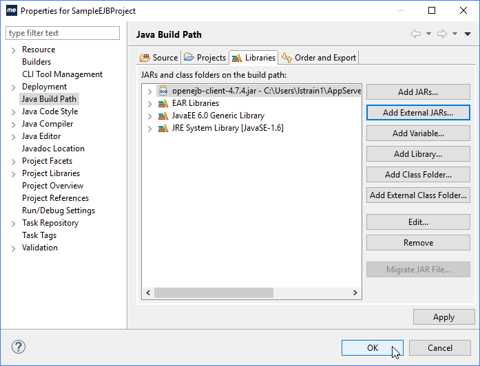 在將代碼添加到客戶端并運行之前,需要將openejb-client-4.7.4.jar添加到構建路徑。該JAR來自TomEE庫文件夾,是可實現EJB遠程調用規范的客戶端。