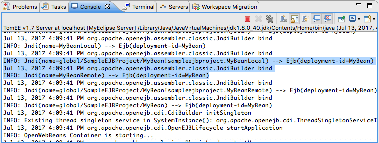 應用程序服務器啟動,并向控制臺視圖顯示有關成功部署Session Bean的消息。