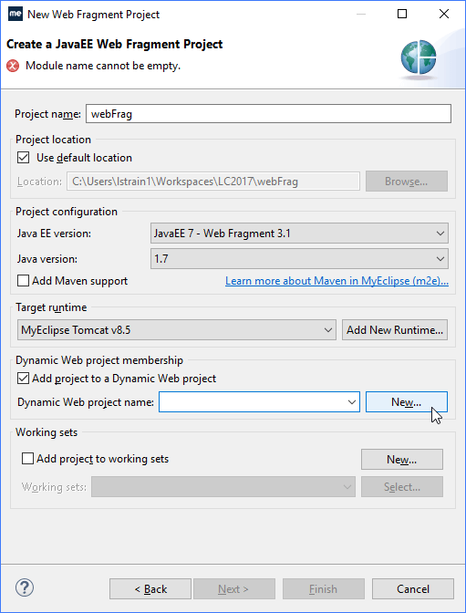 創建的Web片段將包含在新的動態Web應用程序中,該應用程序將與Web Fragment項目一起創建。