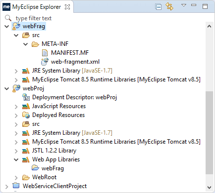 下載webfragment.zip,將現有項目導入MyEclipse。您將有兩個項目——WebFragmentHost和WebFragment。