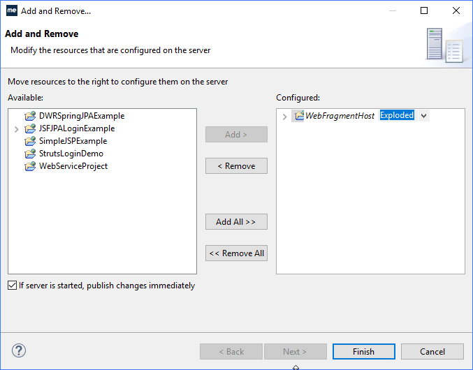 在“Available”列中選擇WebFragmentHost項目,單擊“Add”,然后單擊“Finish”。