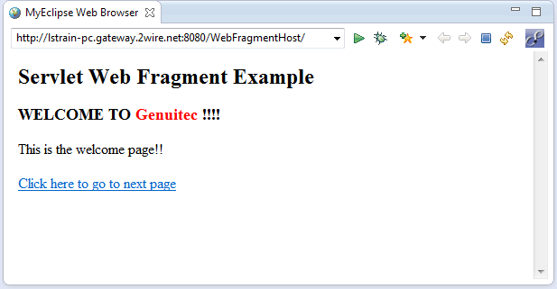 選擇MyEclipse Tomcat服務器,然后單擊“Finish”。Web片段中的WelcomeServlet.java文件在瀏覽器中顯示一個頁面。