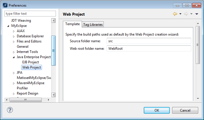 要訪問MyEclipse參數,請選擇Window > Preferences,展開MyEclipse > Java Enterprise Project,然后選擇“Web Project”。