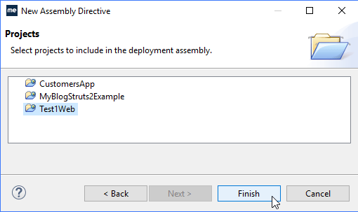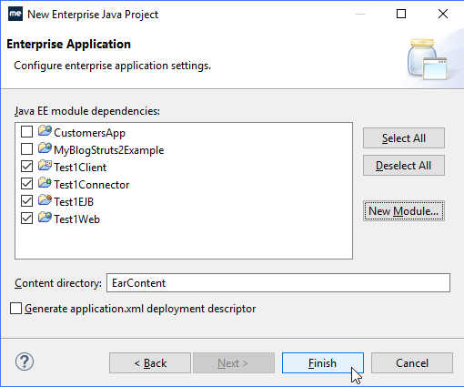 選擇Test1Web項目并單擊Finish。如果列表為空,則沒有可以與該EAR項目關聯的現有項目。