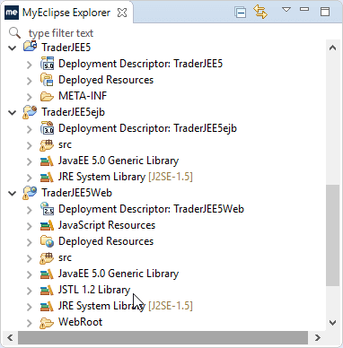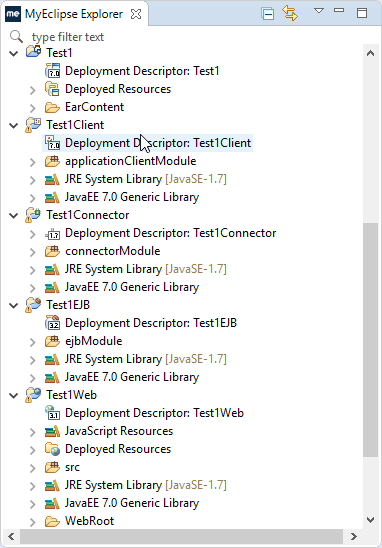 完成向導后,將創建并配置五個MyEclipse項目:Test1、Test1Client、Test1Connector、Test1EJB和Test1Web。