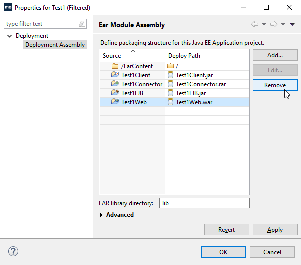 刪除了對Test1EJB模塊項目的Test1Web項目依賴項。