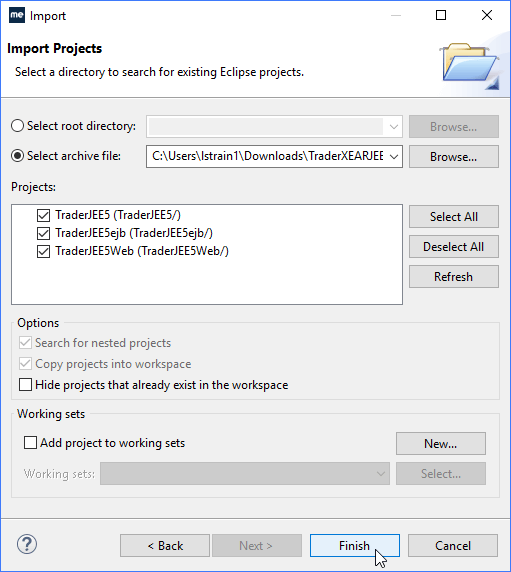 單擊Select archive file選項,瀏覽示例zip文件,然后單擊Finish。