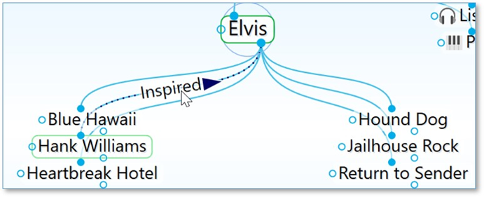 例如,對于鏈接標簽“Inspired”(如下所示),鏈接的方向箭頭顯示“Hank Williams”是Elvis的靈感來源。當您希望表示項目之間的流(如財務關系)時,這也非常有用。