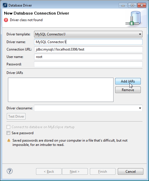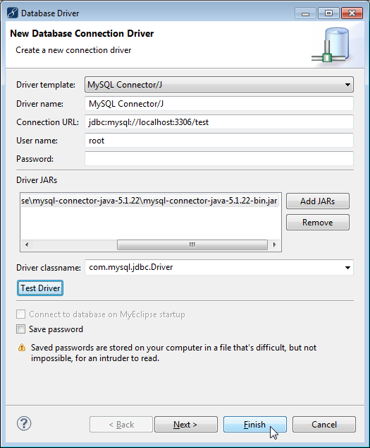 單擊下一步,從數據庫驅動程序下拉列表中選擇MySQL Connector/J,輸入密碼,然后單擊完成。