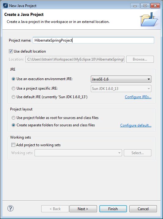 在“Project name”字段中輸入HibernateSpringProject,然后單擊“完成”。系統將提示您切換到Java透視圖。選擇“Yes”。