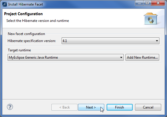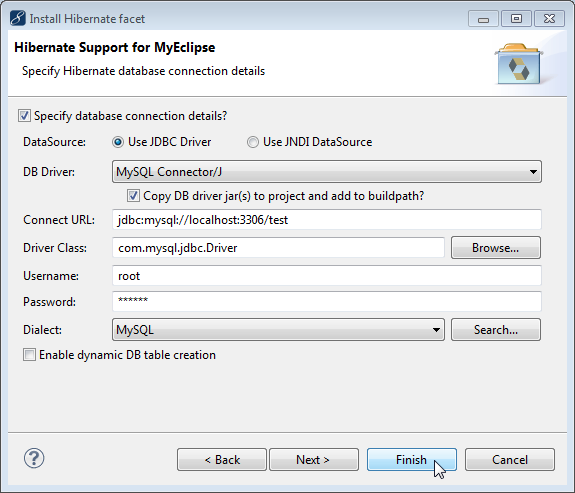 點擊下一步。MyEclipse將創建一個新的hibernate.cfg.xml文件。