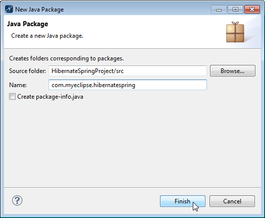 單擊Java package字段旁邊的New為session factory class創建一個新的軟件包,并命名為com.myeclipse.hibernatespring,然后單擊“完成”。